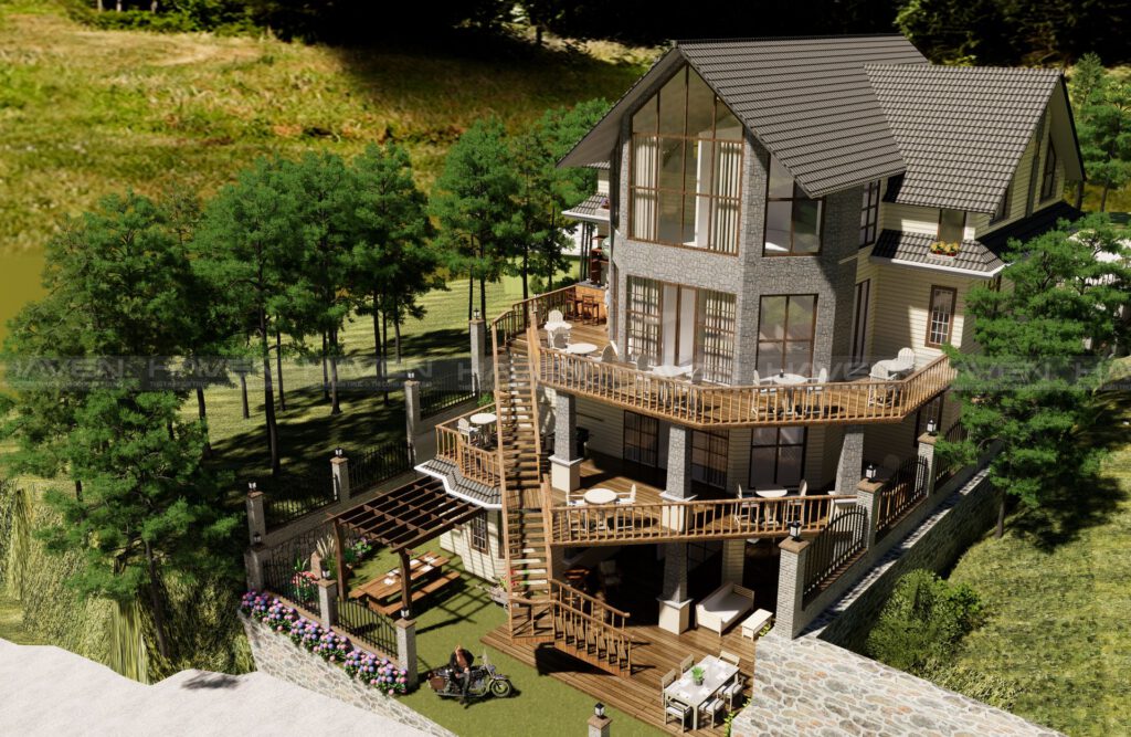 Các chi tiết như cửa sổ kính, ban công bằng gỗ, hay hiên nhà rộng rãi giúp tận dụng tối đa ánh sáng và không gian mở, giúp gia chủ cảm thấy gần gũi với thiên nhiên.